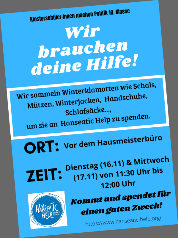 Aktuell läuft das Jahrgangsprojekt „Klosterschüler*innen machen Politik“. Wir haben uns dabei das Thema „Geflüchteten-Hilfe“ ausgesucht, da das Thema uns persönlich sehr wichtig ist und aktuell so viele Menschen auf der Flucht sind, wie noch nie. Dafür brauchen wir eure Hilfe! Wir sammeln am 16.11. und am 17.11. – jeweils zwischen 11:30 und 12:00 – Winterkleider für Geflüchtete. Ihr findet uns vor dem Hausmeisterbüro. Bitte achtet dabei auf die Qualität der Kleidung, die ihr spenden möchtet.