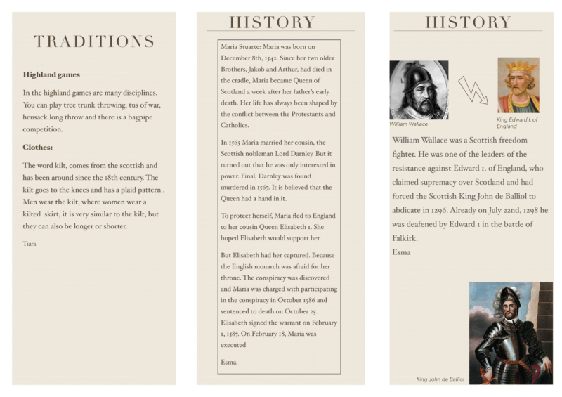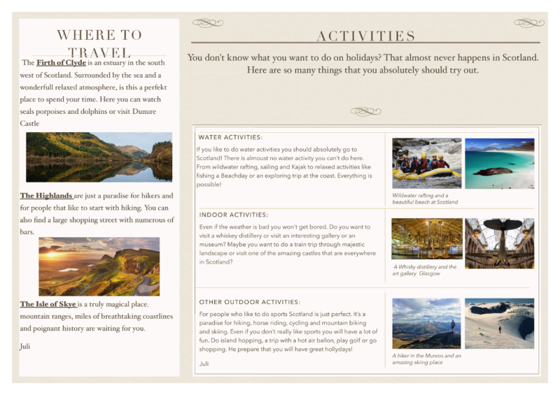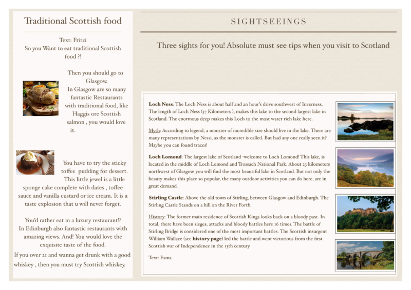 Do you like castles, lakes and long walks? Do you want to know what haggis, ceilidh and hogmanay are? Then you should visit Scotland! Die 7b hat sich im Englisch-Fernunterricht mit Schottland beschäftigt und Reiseführer gestaltet, um das Fernweh in dieser Zeit zu lindern. Vielleicht finden sich in diesen Reiseführern ja Inspirationen für die Zeit, in der man wieder reisen kann? Hier ein Beispiel: