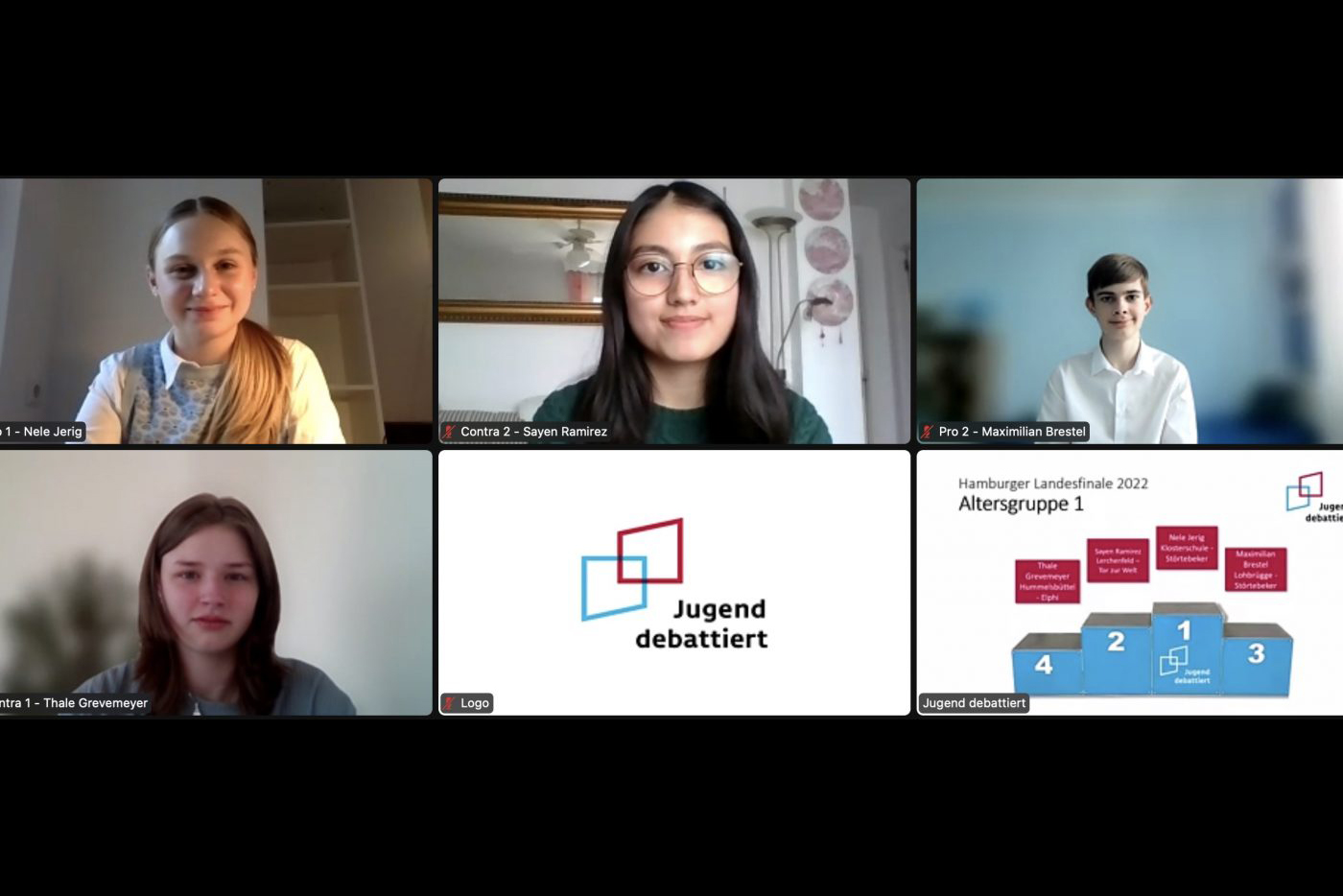 Nele debattierte auf Pro 1 zu der Frage: „Soll der Neubau von Einfamilienhäusern in Hamburg verboten werden?“. In ihrer Argumentation konzentrierte sie sich auf soziale Aspekte, insbesondere darauf, wie durch die Maßnahme die Wohnungsnot und damit auch die starken Mietsteigerungen in Hamburg eingedämmt werden könnten. Ihr Mitdebattant auf Pro 2 Maximilian Brestel vom Gymnasium Lohbrügge fokussierte sich auf positive Effekte der Maßnahme für die Bekämpfung des Klimawandels. Am Ende erhielt nur Sayen Ramirez vom Gymnasium Lerchenfeld, die auf Contra 2 sehr ausdrucksstark und geschickt die Schwachpunkte der Maßnahme herausarbeitete, eine noch bessere Bewertung durch die Jury als Nele.