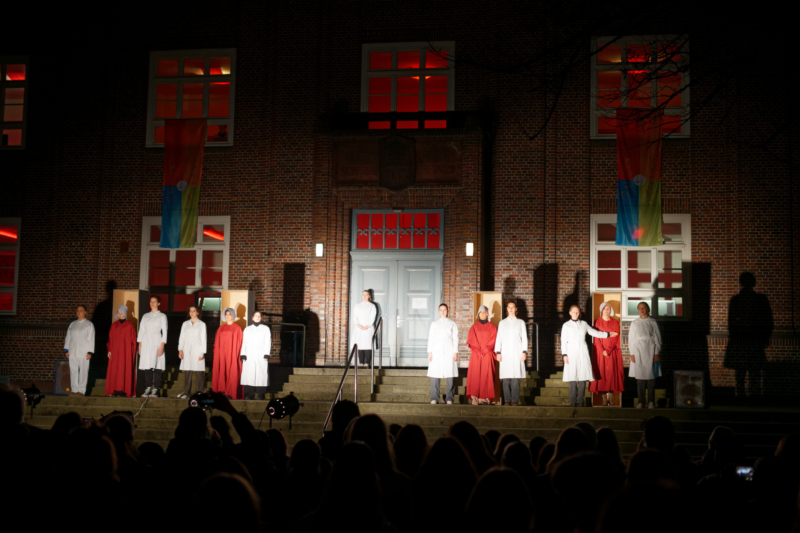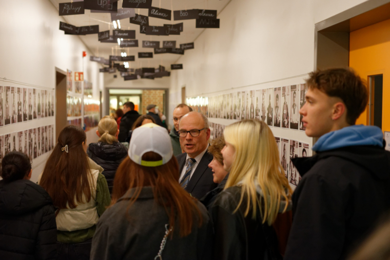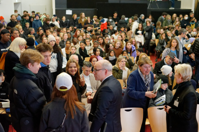 Besonders zu erwähnen ist bei dieser Jubiläums-Kulturnacht der Festakt in der Aula, zu dem als besonderer Gast Schulsenator Ties Rabe geladen war. Ganz offenbar angetan von dem anregend-lockeren Veranstaltungsrahmen und der Auftaktszene des Musikprofils zur Schulgeschichte tat es der Senator den einleitenden Worten der Schulleiterin Frau Brandt-Dammann gleich, legte kurzerhand das Redemanuskript beiseite und griff zwei der in der Theaterszene angesprochenen Meilensteine der Klosterschul-Geschichte auf: den Wandel von der Mädchenschule zur Koedukation in den 60er Jahren und den Aufbruch zur gebundenen Ganztagsschule, den die Klosterschule als erstes staatliches Gymnasium Hamburgs ein Vierteljahrhundert später unternommen hat. In diesem Zusammenhang wies Senator Rabe auf die sich stetig wandelnden Kompetenz-Anforderungen hin, denen sich die Schulen heute zu stellen hätten und denen die Klosterschule mit ihrem besonderen kulturellen Profil erfolgreich nachkomme. Im Anschluss an den von der ConcertBand sowie einer der Dance-Groups begleiteten offiziellen Teil tauchte der Senator zusammen mit der Schulleitung in das verwandelte, bespielte und inszenierte Schulgebäude ein. Begleitet von vielen Gesprächen mit Schüler*innen konnte er sich so in Bild machen von der besonderen Atmosphäre dieser Jubiläums-Kulturnacht und ließ sich überzeugen, dass Altwerden und Jungbleiben keineswegs Gegensätze sein müssen.