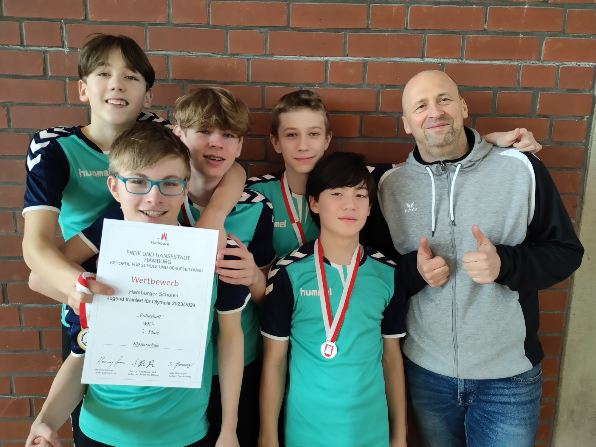 Die Volleyball-Helden vom Westphalensweg schlummern über 85% des Spiels herum, wachen spät auf und setzen sich gegen das Gymnasium Lerchenfeld im Tie-Break durch. Im Finale geht es gegen das Gymnasium Kaiser-Friedrich-Ufer um die Teilnahme am Bundesfinale in Berlin im September 2024. Mit zu vielen Fehlern am Aufschlag gelingt es während des gesamten Spiels nicht, in Führung zu gehen, sodass den Jungs aus den Klassenstufen 9 und 6 die Silbermedaille bleibt. Ein besseres Ergebnis war möglich, aber verletzte und erkrankte Spieler konnten nicht gleichwertig ersetzt werden. Das Gold-Ding muss jetzt in anderen Wettbewerben erspielt werden – Abwarten…!