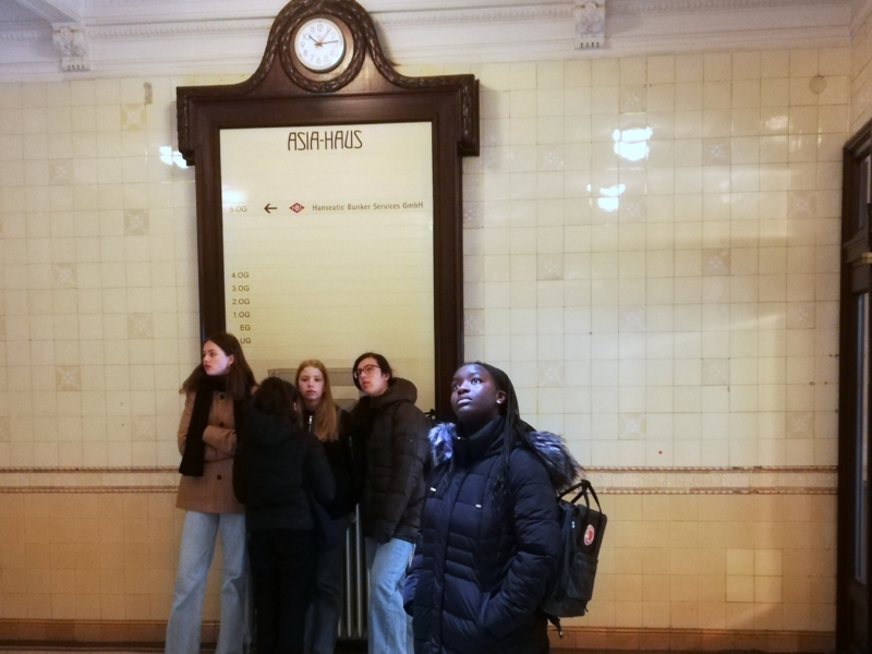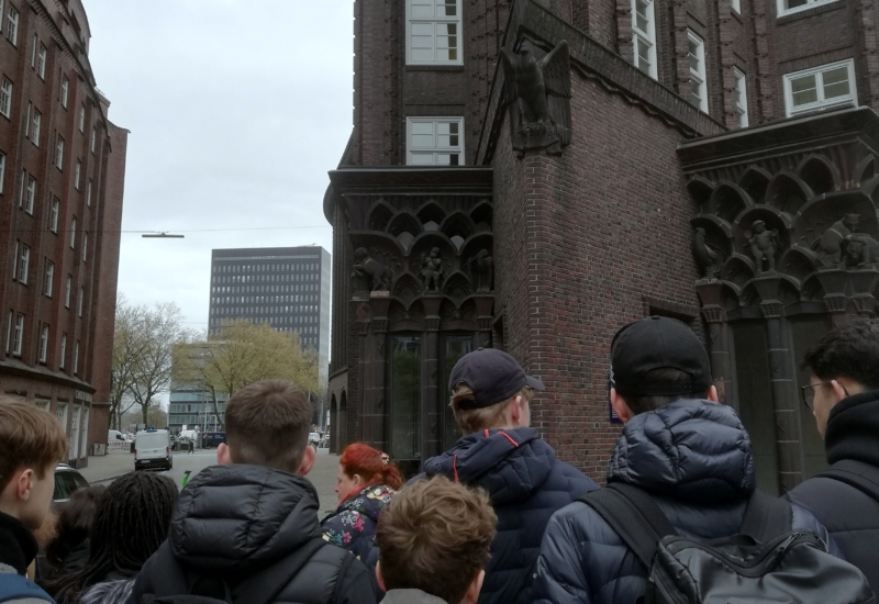 Die Schüler*innen bestaunten nicht nur die reichverzierten Treppenhäuser, sondern erfuhren auch viel über Hamburgs Rolle im ungleichen Handel der Weltwirtschaft, das koloniale Erbe, Handelswaren und die verschiedenen Phasen der Globalisierung, die die Stadt reich gemacht haben.